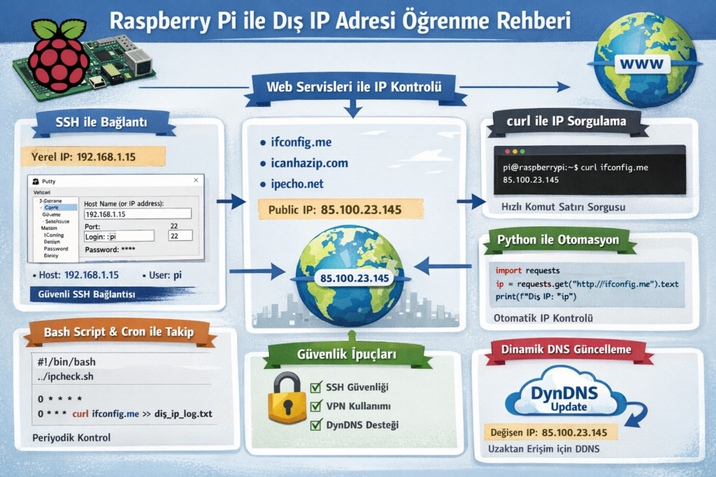 Raspberry Pi üzerinde dış IP adresini öğrenmek oldukça basit bir işlemdir. curl gibi araçlar sayesinde bu işlem birkaç saniye içinde gerçekleştirilebilir. Ayrıca scriptler ve cron görevleri kullanılarak bu süreç tamamen otomatik hale getirilebilir.