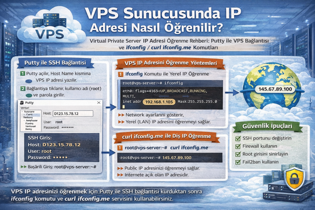 VPS sunucularında IP adresini öğrenmek oldukça basit bir işlemdir. Putty ile sunucuya bağlandıktan sonra birkaç farklı komut kullanarak IP adresini görüntüleyebilirsiniz.